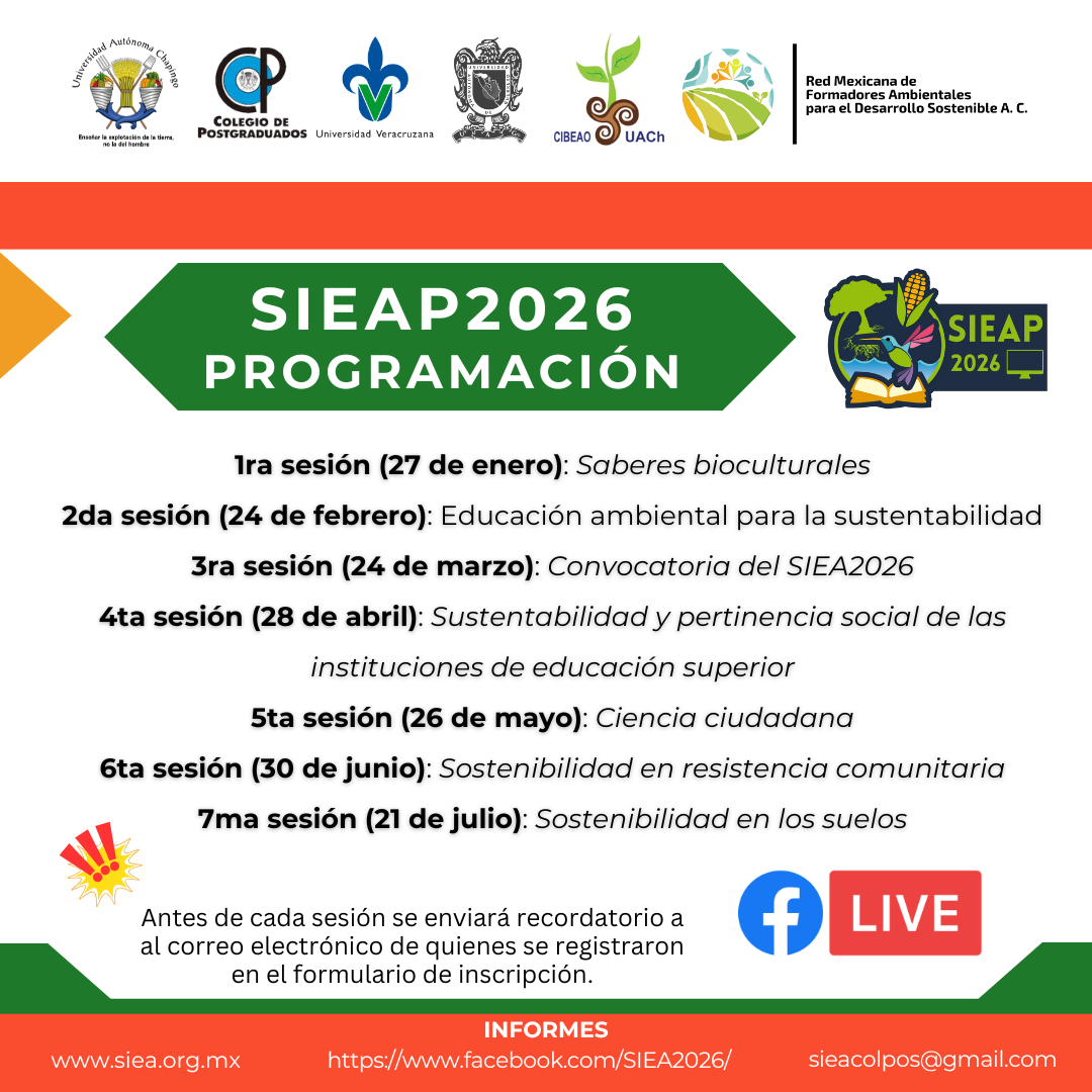 Te invitamos al "V Seminario Permanente de Educación Ambiental y Desarrollo Sustentable" (SIEAP2026), una experiencia 100% virtual que se transmitirá exclusivamente por Facebook Live. Este seminario te permitirá profundizar en temas clave para cuidar el medio ambiente y fomentar un cambio positivo en nuestras comunidades.